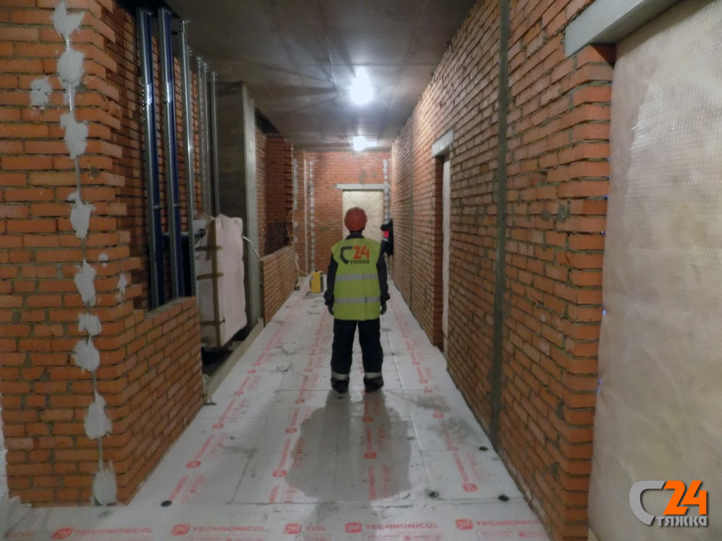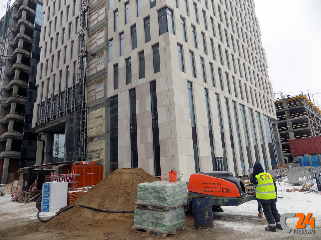 Делаем стяжку в новых корпусах на знаковом объекте. Доверие заказчиков обязывает вдвойне. Полусухая стяжка делается по предварительно уложенному подстилающему слою из плит экструдированного полистирола и из теплоизоляционных плит на базальтовой основе. Поверхность монолитного основания предварительно обеспыливается, обрабатывается праймером, на клей для полистирольных плит монтируются плиты ЭППС с фиксацией на пластиковый дюбель «гриб». Далее все традиционно-стяжка механизированным способом с фиброармированием.
