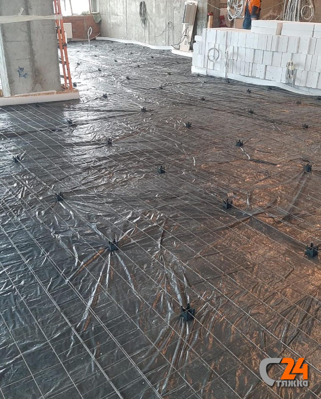 Выполнены работы по устройству подстилающего слоя из полистиролбетона и армированной цементно-песчаной стяжки в современном офисном центре.