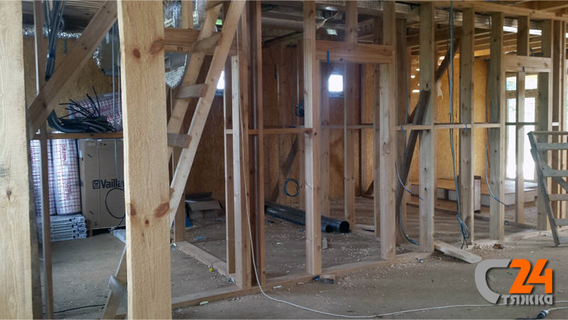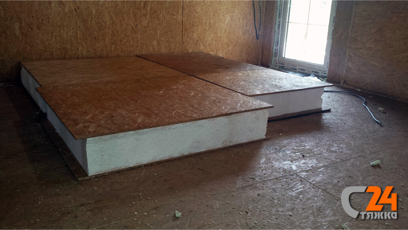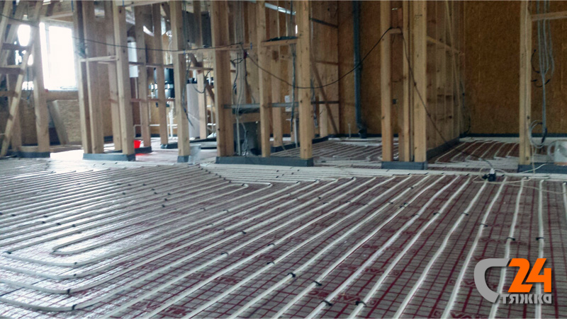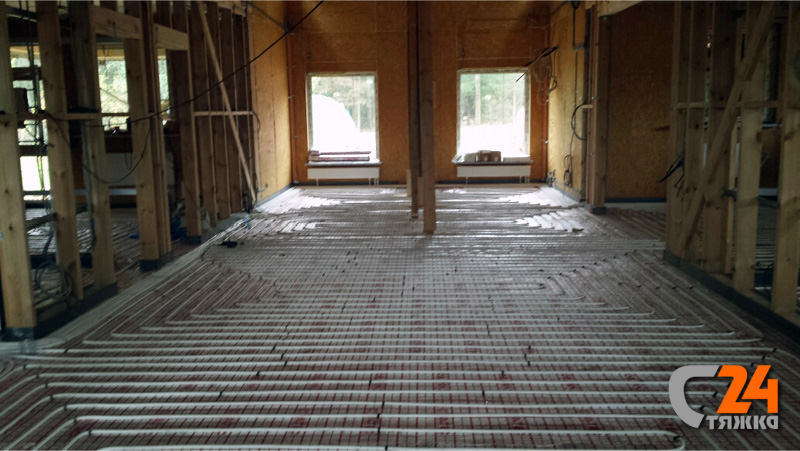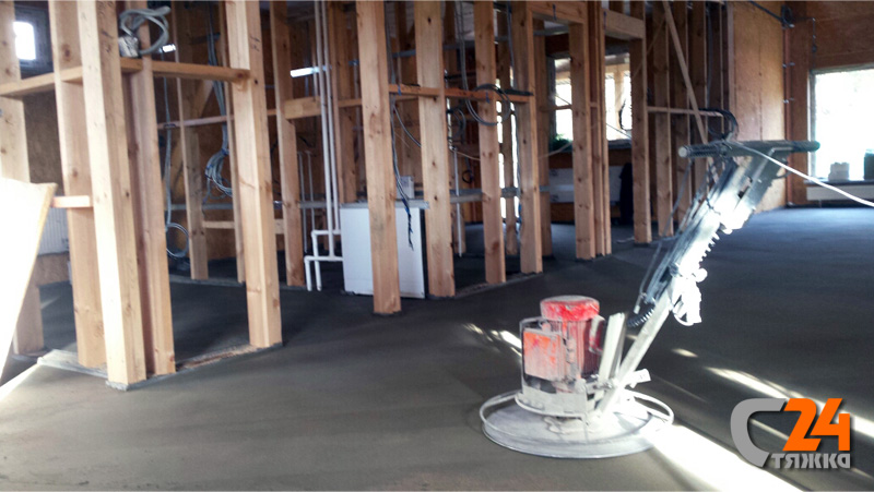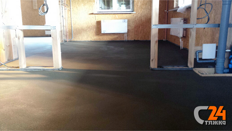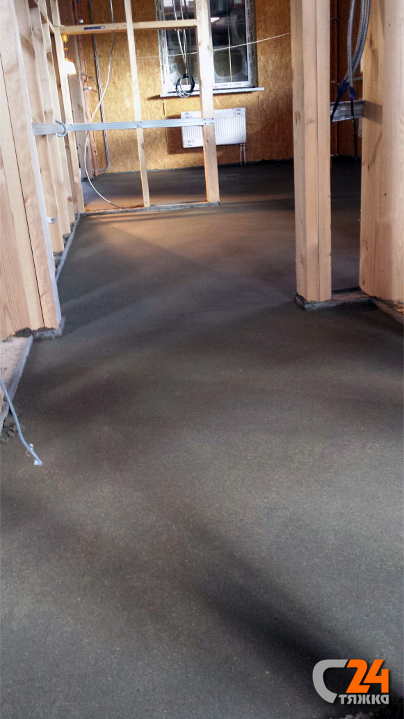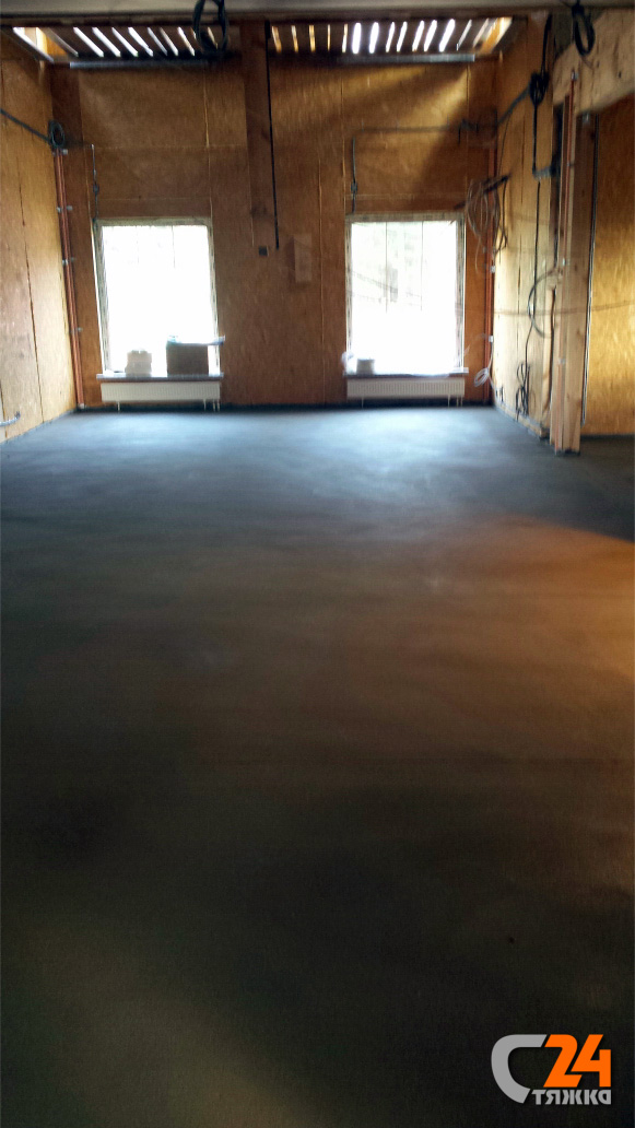 Выполнена стяжка пола по системе теплый пол в деревянном доме. Полы в этом доме сделаны из СИП панелей, по которым были уложены контура водяного обогрева полов. Средняя толщина цементно-песчаной полусухой стяжки составила 70 мм, и была произведена таким образом, что над верхом трубы толщина слоя составила 50 мм. Это оптимальное значение, при котором тепло будет комфортно и равномерно распределяться. 165 кв. м - стяжка сделана за один день силами одной механизированной бригады.