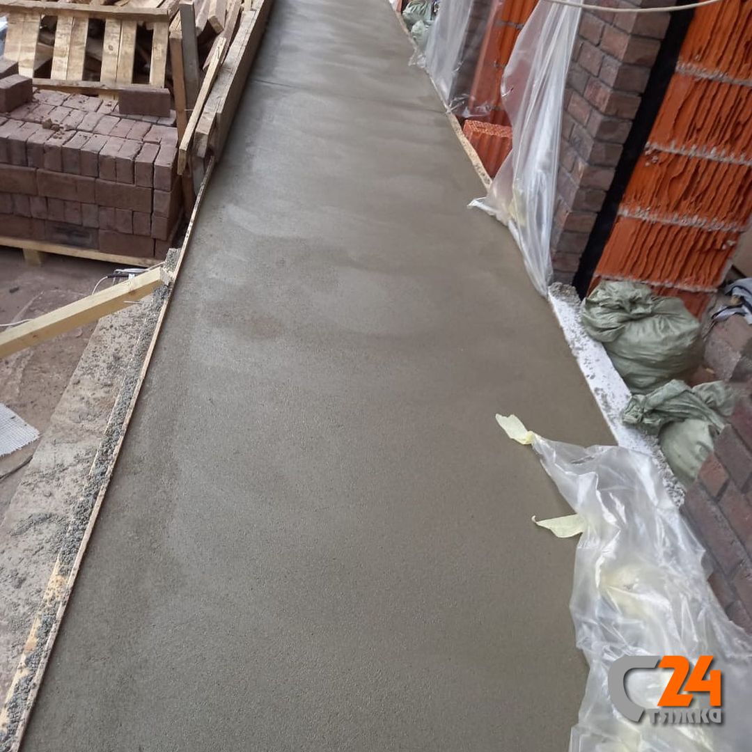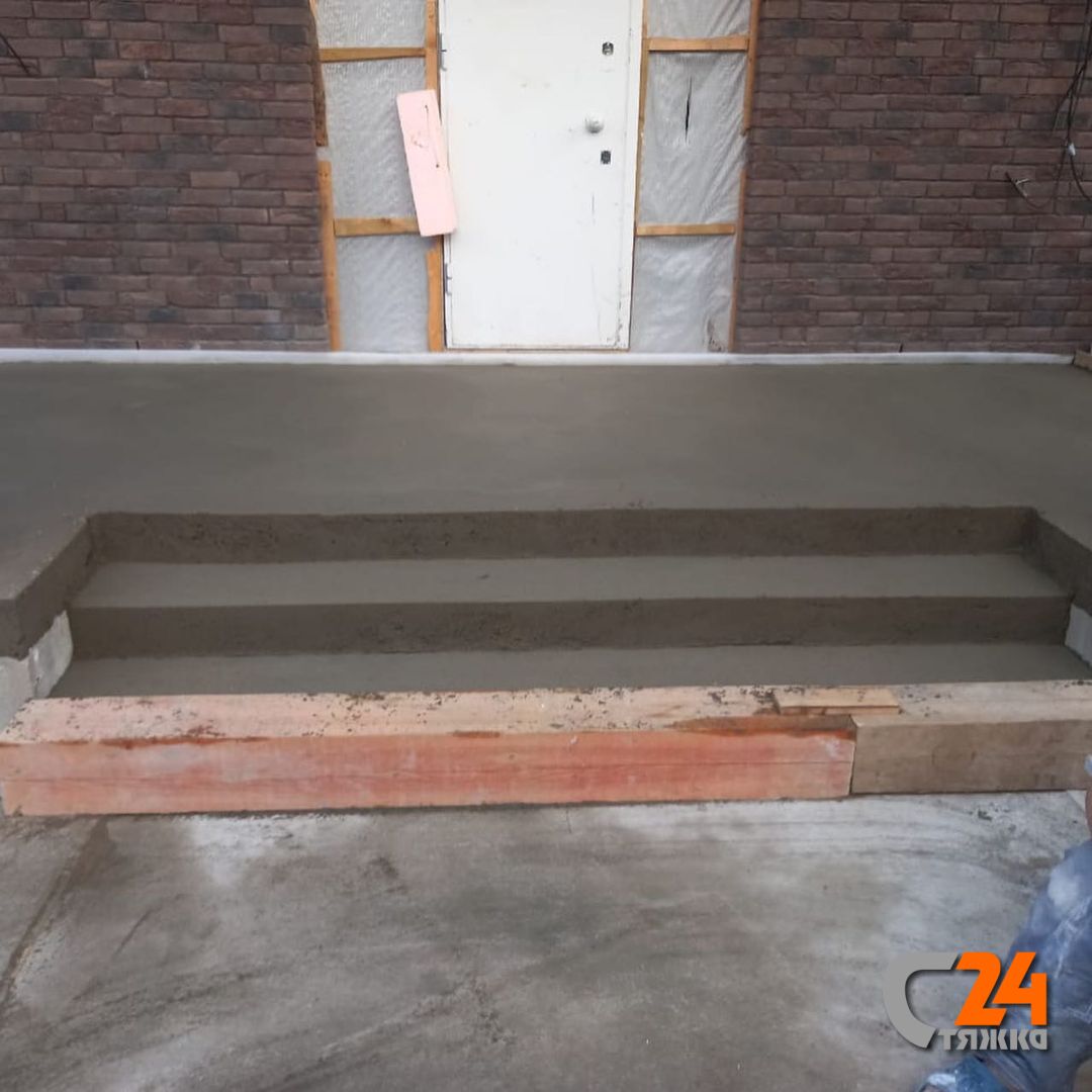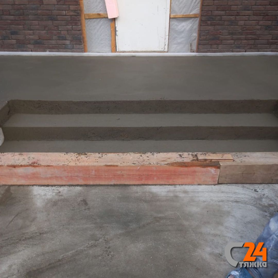 Завершены работы по устройству подстилающего слоя из полистиролбетона и цементно-песчаной стяжки в загородном частном доме. В очередной этап выполнены работы по устройству стяжки на уличной территории, сформированы ступени из цементно-песчаного раствора.