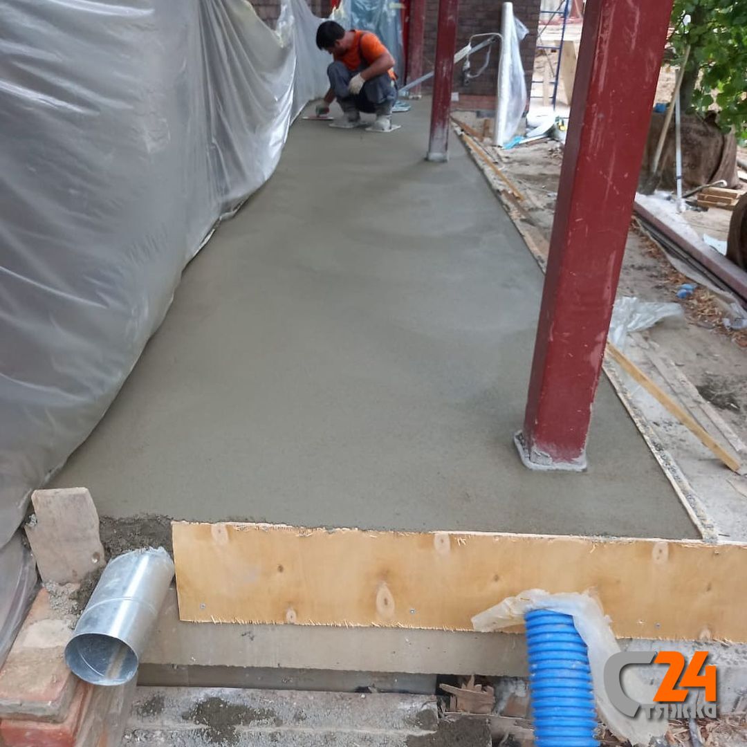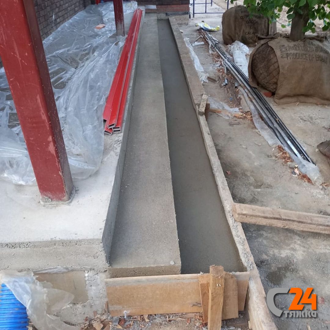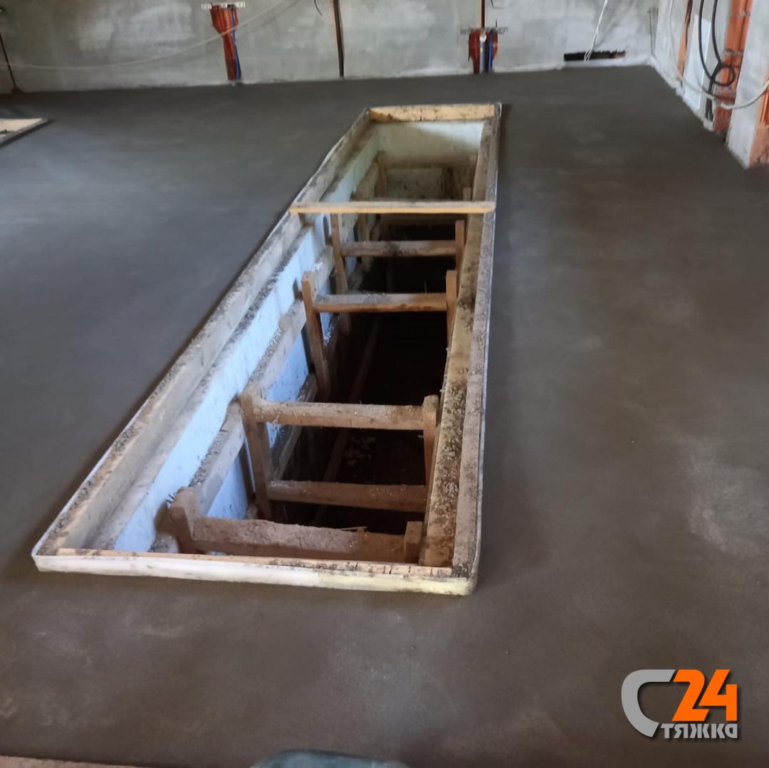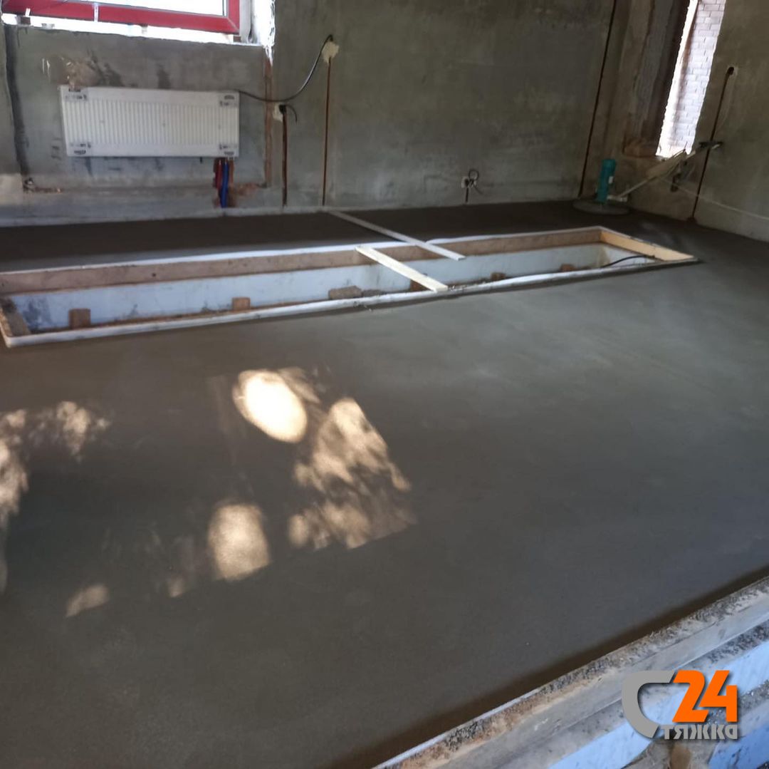 Завершены работы по устройству подстилающего слоя из полистиролбетона и цементно-песчаной стяжки в загородном частном доме. В очередной этап выполнены работы по устройству стяжки на уличной территории, сформированы ступени из цементно-песчаного раствора.