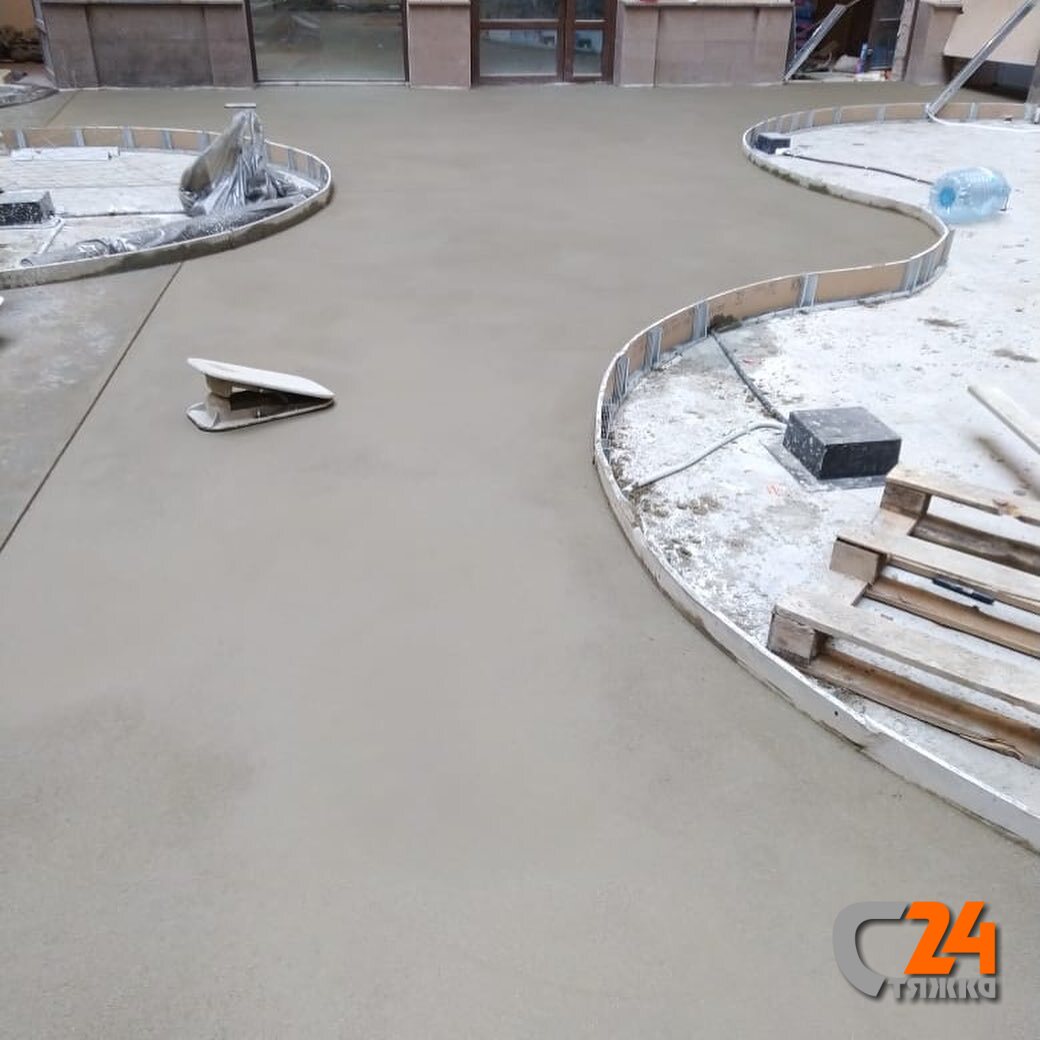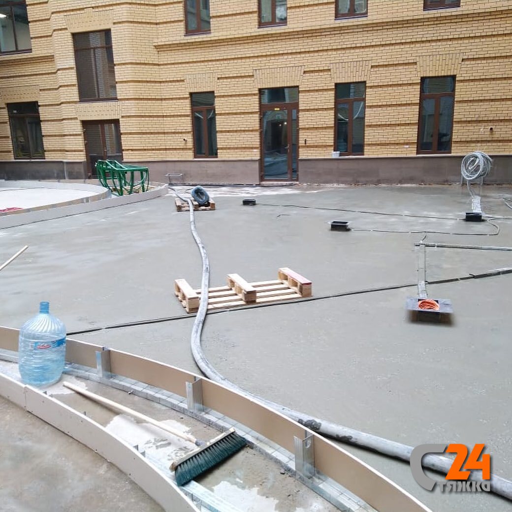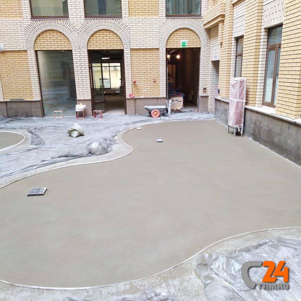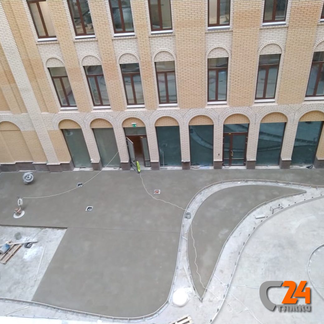 Сделали высокопрочную контактную стяжку с предварительным фрезерованием ж/б основания для создания надежного адгезионного моста. Стяжка разноуровневая, фигурная, под разные типы декоративного покрытия-тераццо и полимерцемент.