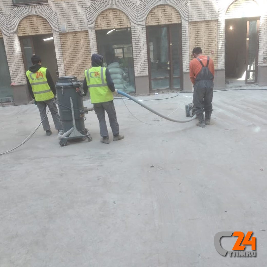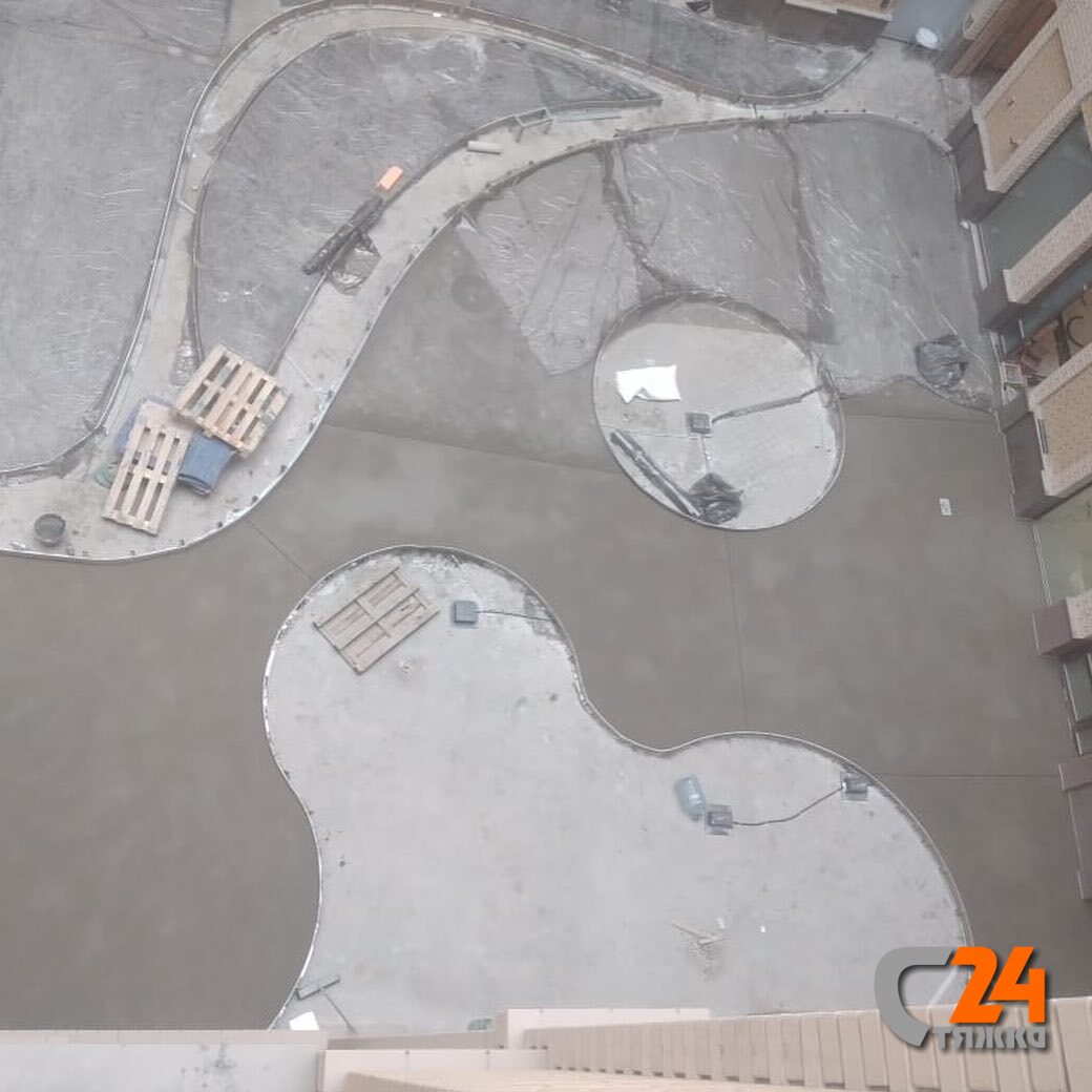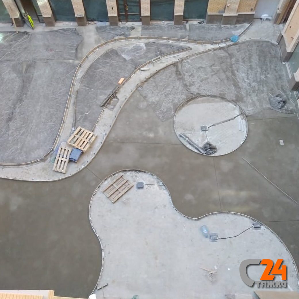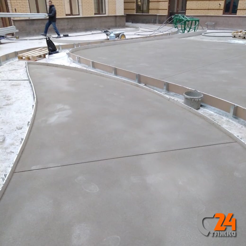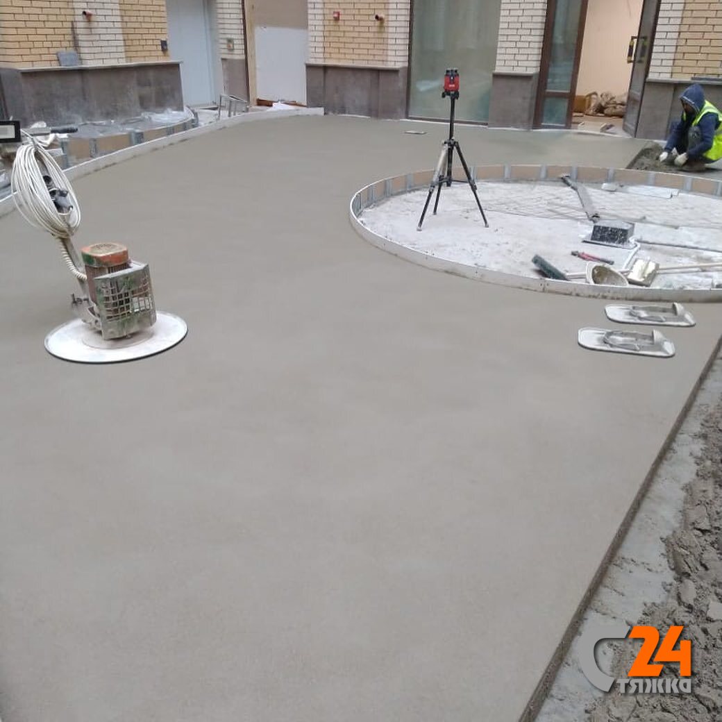 Сделали высокопрочную контактную стяжку с предварительным фрезерованием ж/б основания для создания надежного адгезионного моста. Стяжка разноуровневая, фигурная, под разные типы декоративного покрытия-тераццо и полимерцемент.